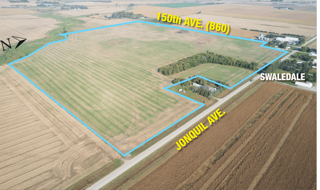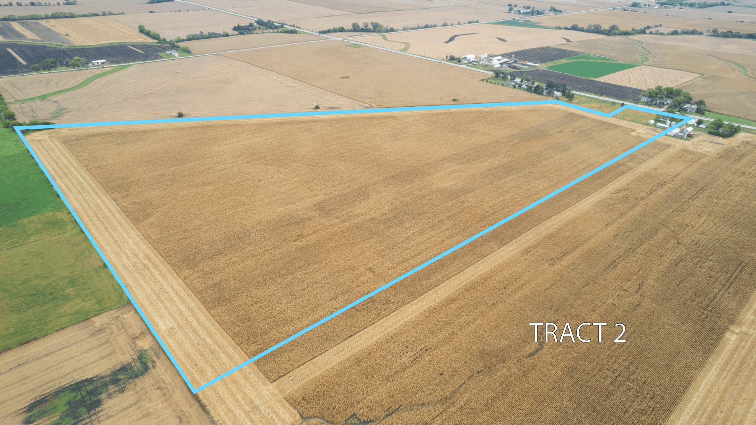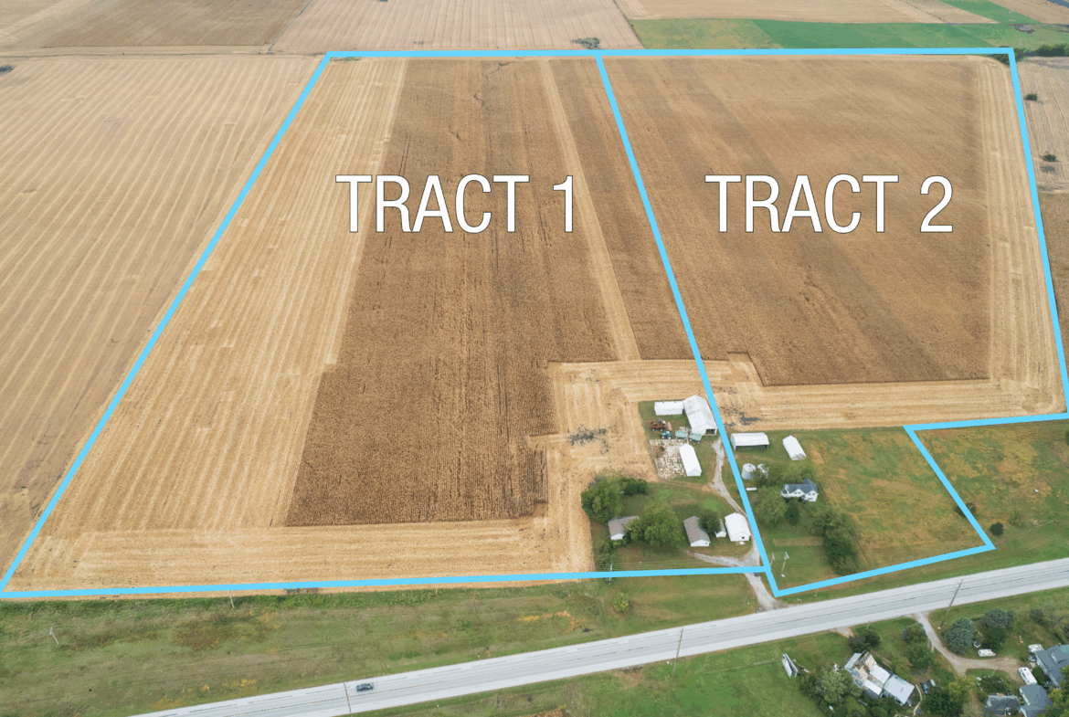 Both tracts have upper 80โs CSR2 cropland with two homes and older outbuildings in a commercially zoned area. The property has county tile running from the NE corner heading west. There are no records of lateral tile lines. The land is rented for 2025 but the lease is canceled for the 2026 crop year.